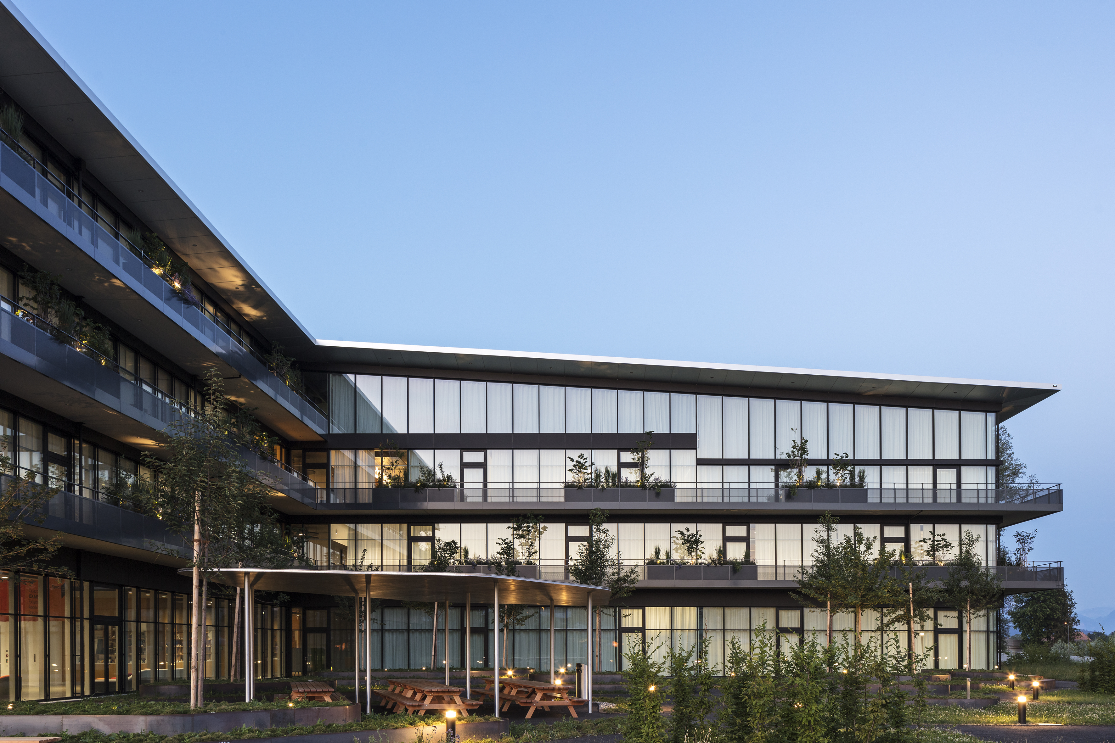 The building is facing the mountain panorama, the stream, and the public space in the area around the railway station. This provides the site with an attractive, sheltered outside space – shielded from the highway. The space can be used by employees during breaks and for meetings. It also serves as a representative entrance area and courtyard in front of the building. In terms of noise reduction, the importance is not the distance from the highway, but the position of the building with the sun-exposed outside space in front.
