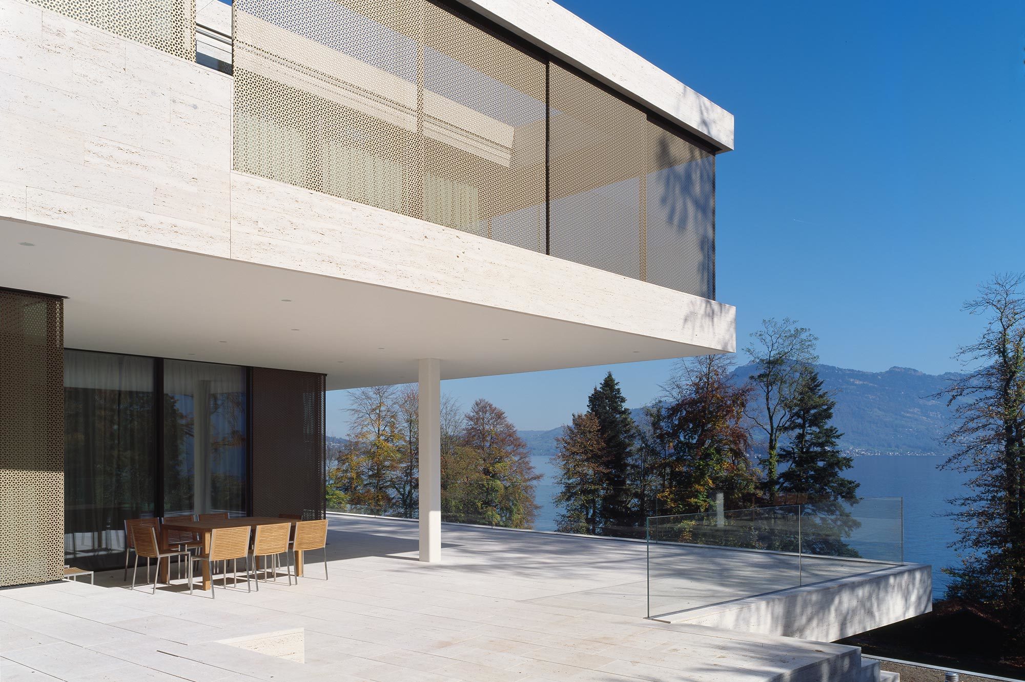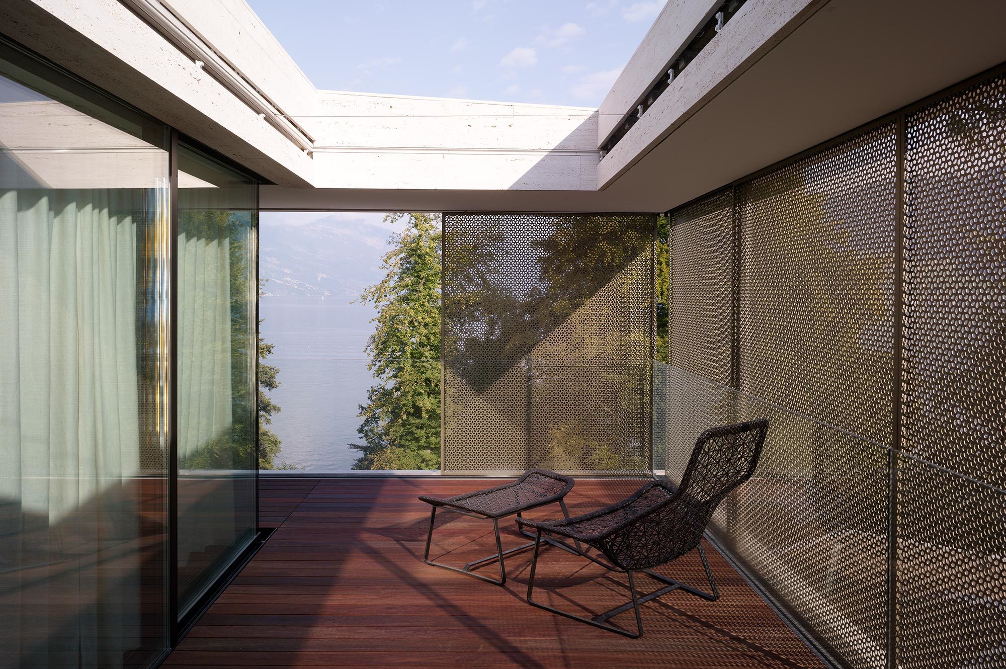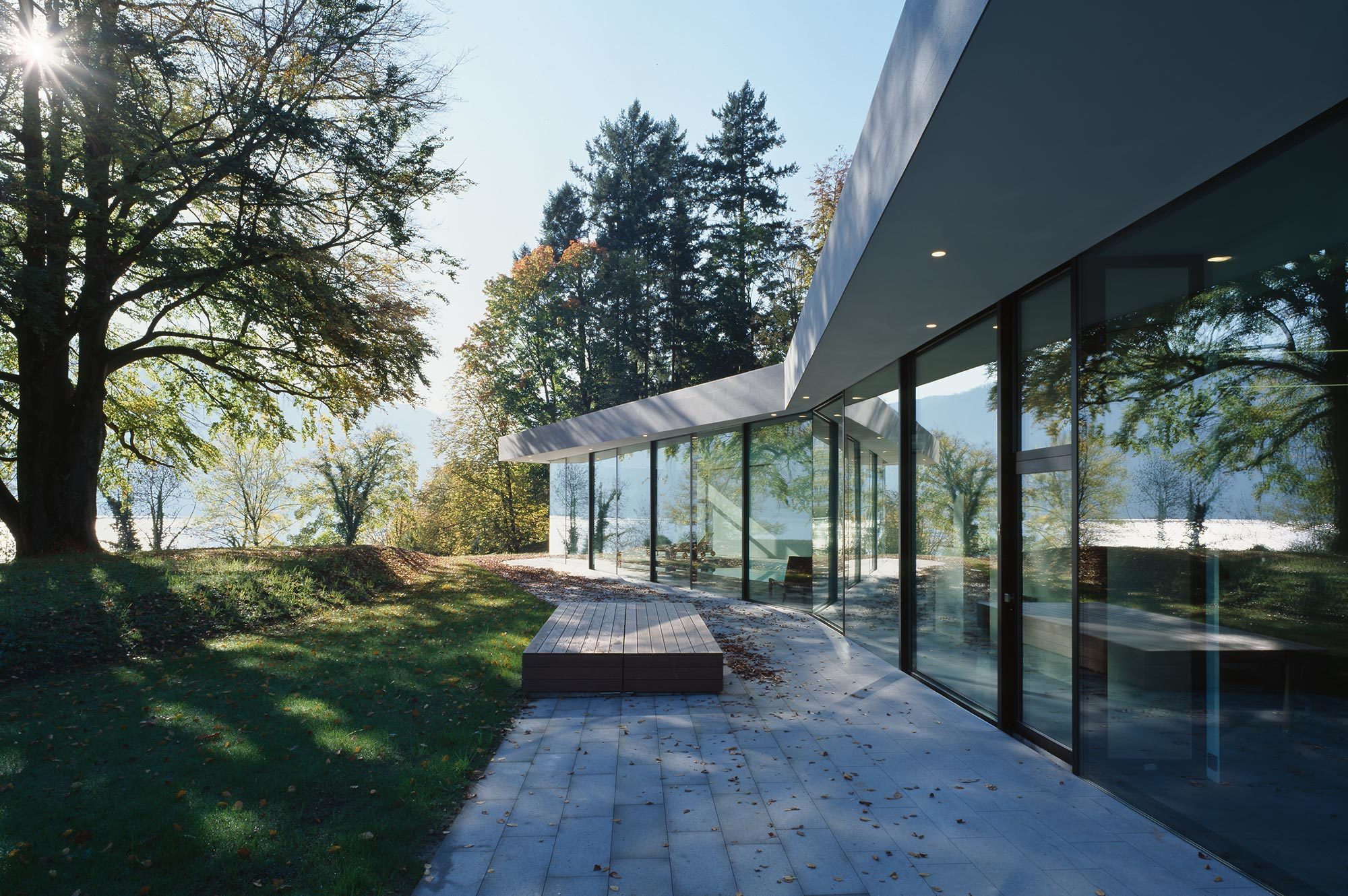 The cantilevers protect the building from sun and weather while protecting the outdoor spaces. The lower level, seen from the lakeside, appears as a staggered joint and underlines the horizontality of the floors. The roof is designed as a discrete hipped roof with a flat pitch.