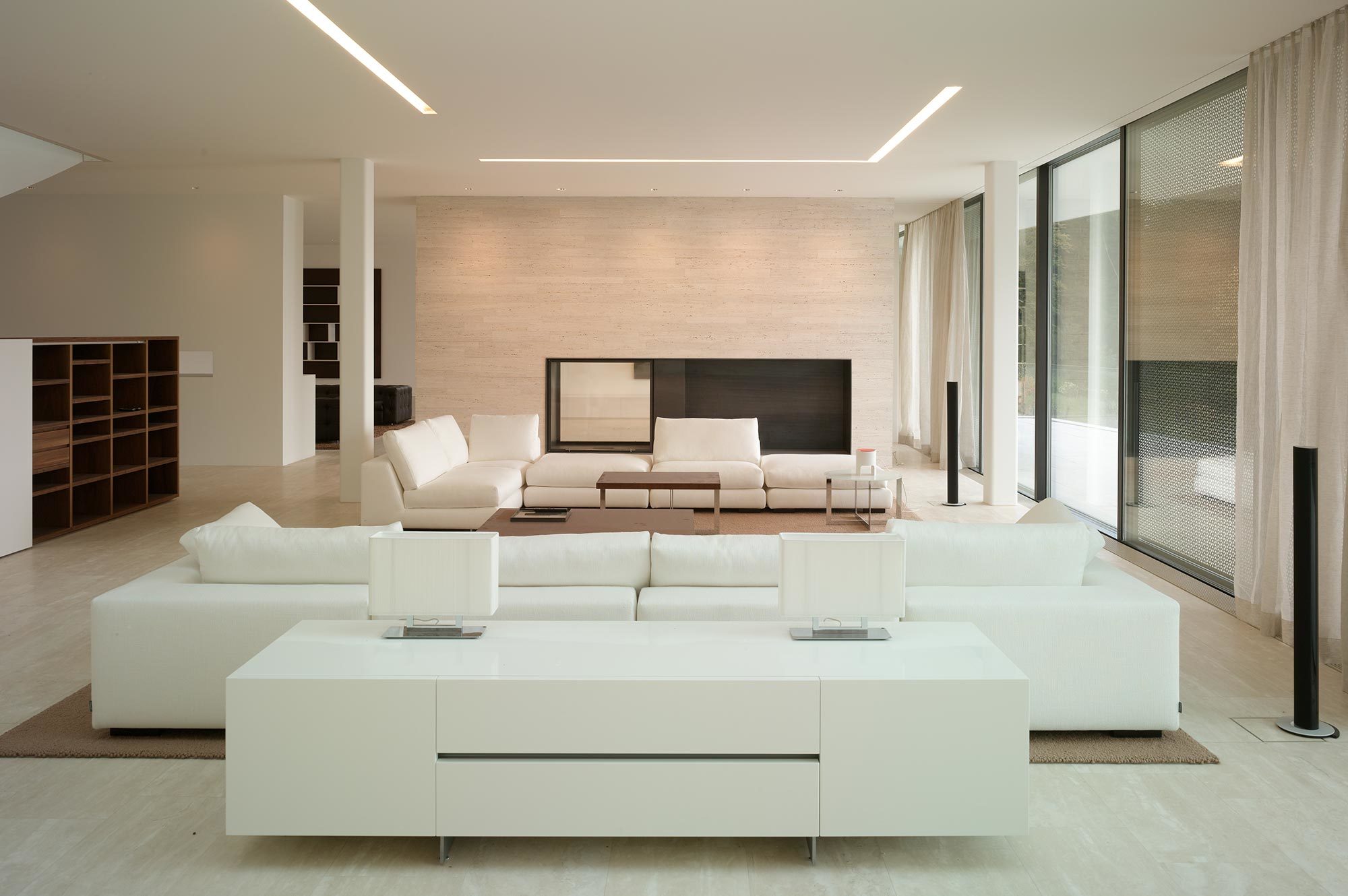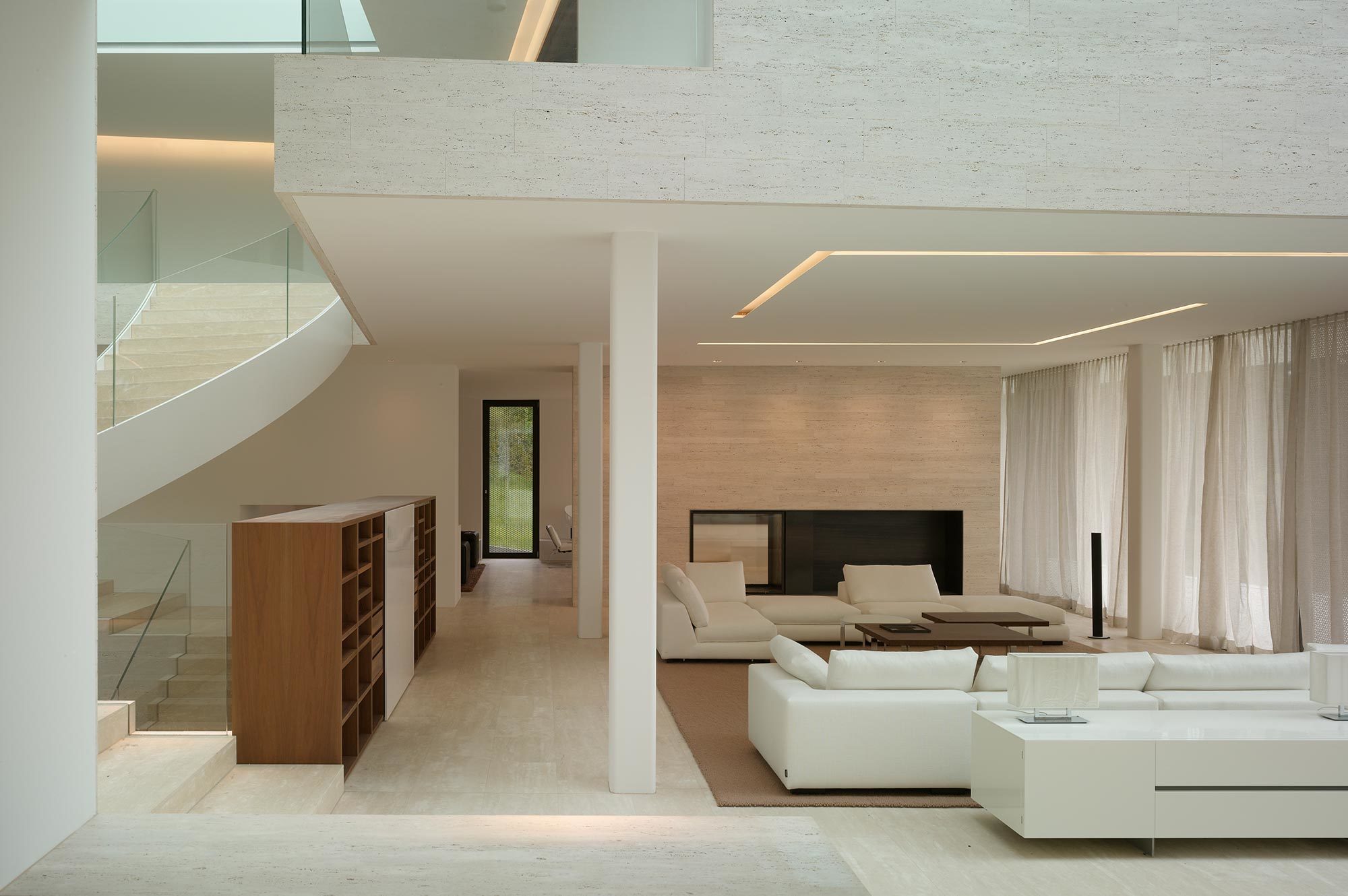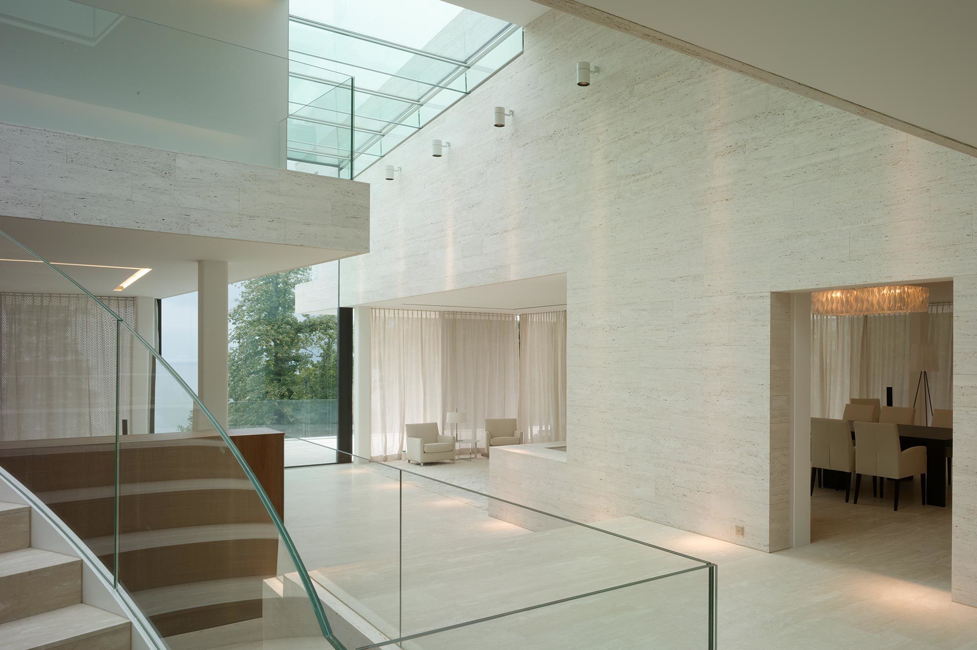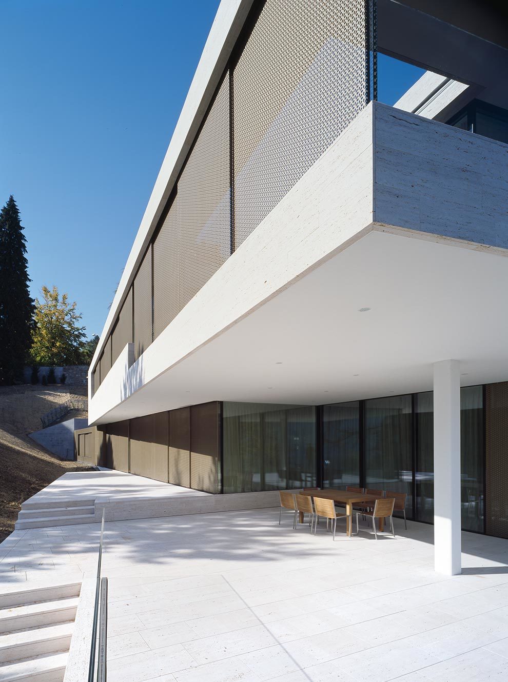 The basement and the upper level are built as solid volumes of light-colored natural stone. The roof surfaces are of the same shade. The ground floor is connected with the employee apartment and the garage. It looks like a shell of glass and metal. As a result, the ground floor appears to be inserted between the solid lower and upper levels, underscoring the architectural concept.