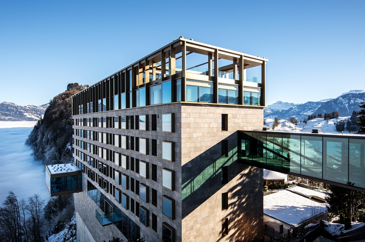 Das Hotel thront auf 875 m ü. M. wie ein Wolkenkratzer über dem gläsernen Sockel. Die Fassade ist in hellen Sellenberger Muschelkalk eingefass. Mit seiner grau-braunen Struktur ähnelt der Stein dem vorhandenen Fels auf dem Bürgenstock. Die Materialisierung der Fassade greift die Thematiken des historischen Bestandes auf und ergänzt diese mit moderner Bauweise. Kontrastiert wird die Steinfassade hauptsächlich von den Metallelementen wie der Pfosten-Riegel-Verglasungen und den Lochfenstern. Diese sind, wie auch die markanten Vordächer, in edlem Bronzeton gehalten.