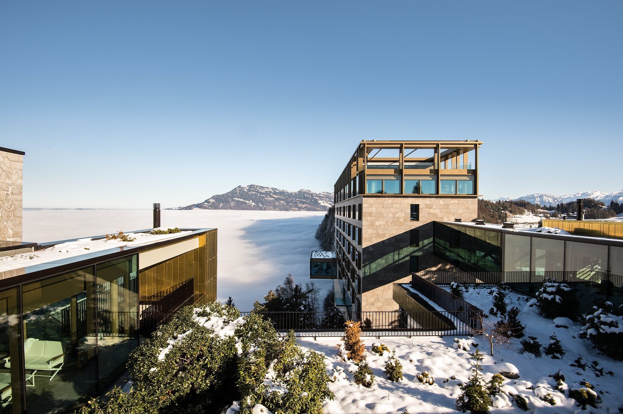 Der imposante Baukörper fügt sich natürlich zwischen das Hotel Palace und das Bürgenstock SPA ein und orientiert sich Richtung Norden nach Luzern. Das Gestaltungskonzept des neuen Hotels und dessen Inneneinrichtung ist an Szenenbilder legendärer Filme angelegt. Mit dem Planungsentwurf «Goldfinger» hat unser Team von Rüssli Architekten den Architekturwettbewerb 2010 gewonnen.