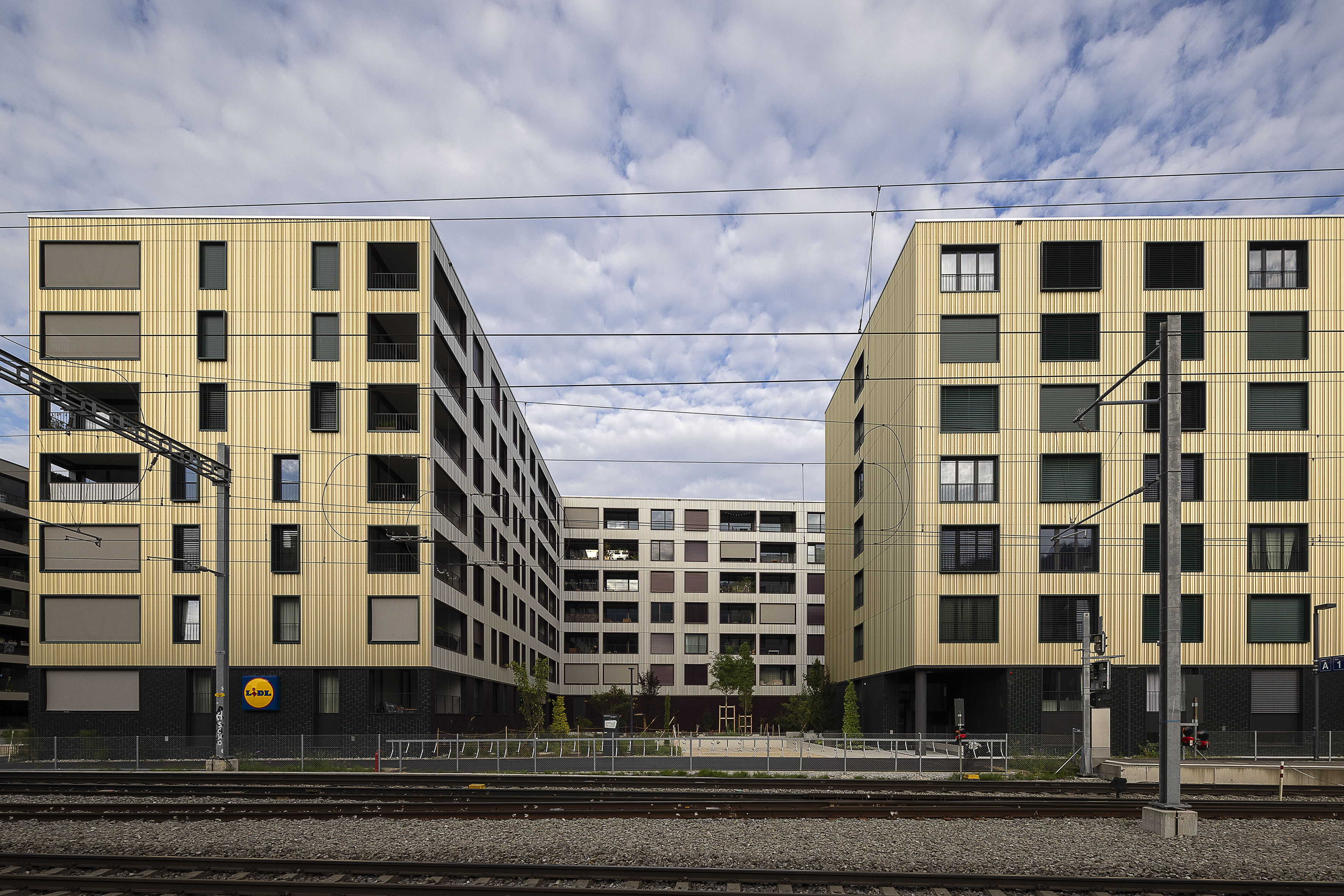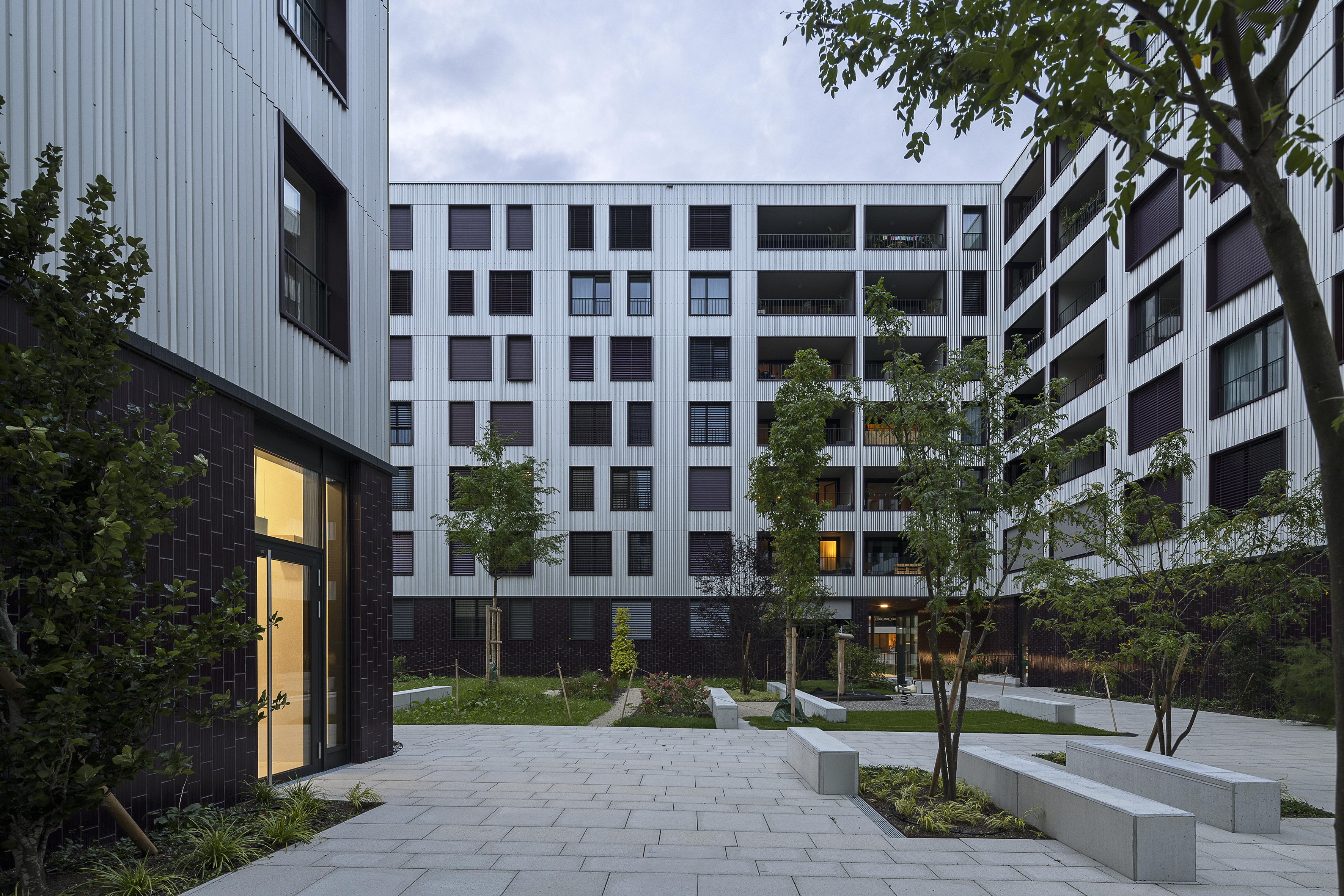 Durch die unterschiedlichen Materialisierung soll der Gebäudesockel klar als solcher wahrgenommen werden. Die grosszügig gestalteten Eingangsbereiche zu den Wohnungen ermöglichen ein einladendes Nach Hause kommen. Auch der offene Innenhof soll als Aufenthalts- und Begegnungsort grosses Potenzial bieten. Der Eingangsbereich zum Innenhof wird durch eine offene gedeckte Ecke akzentuiert.