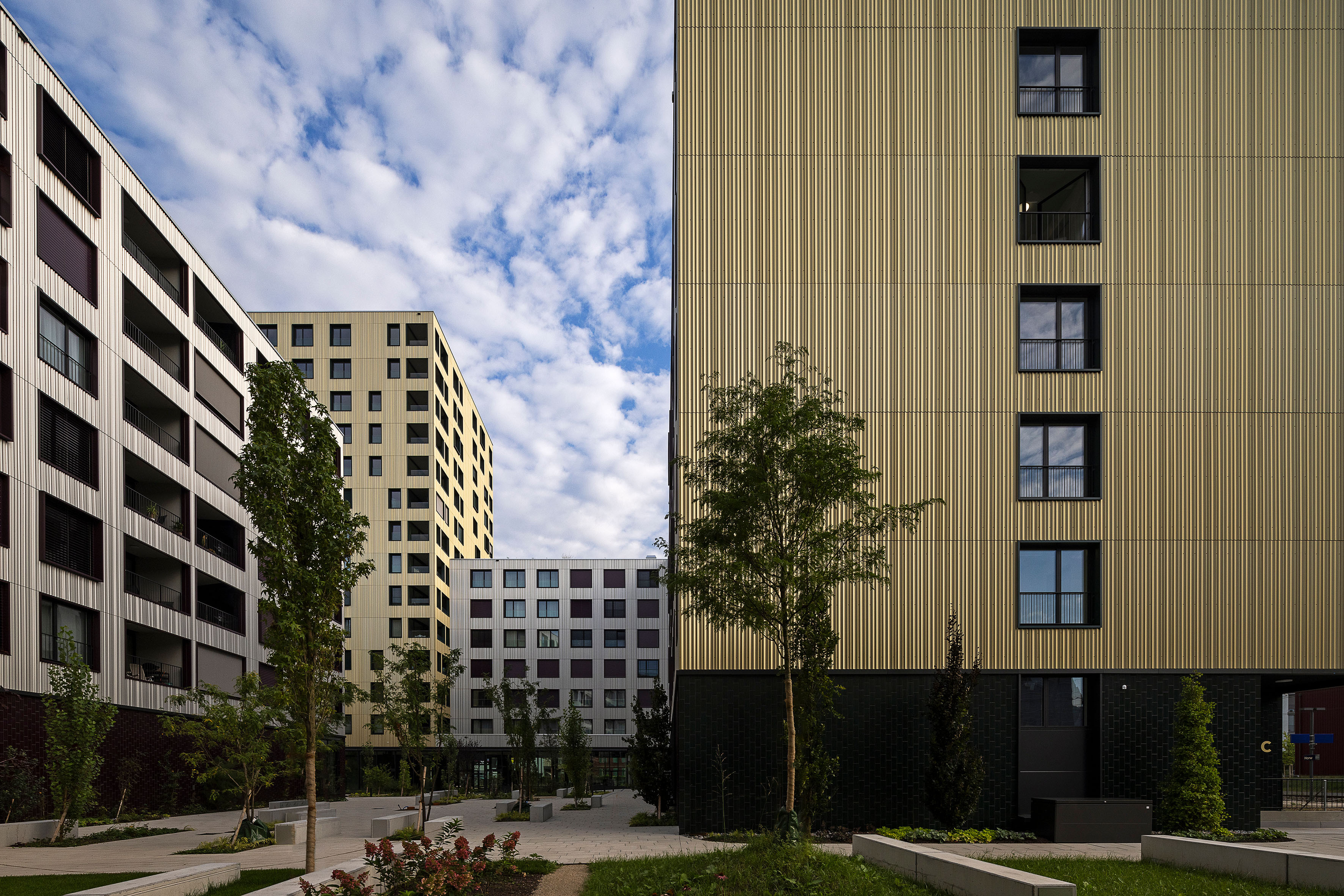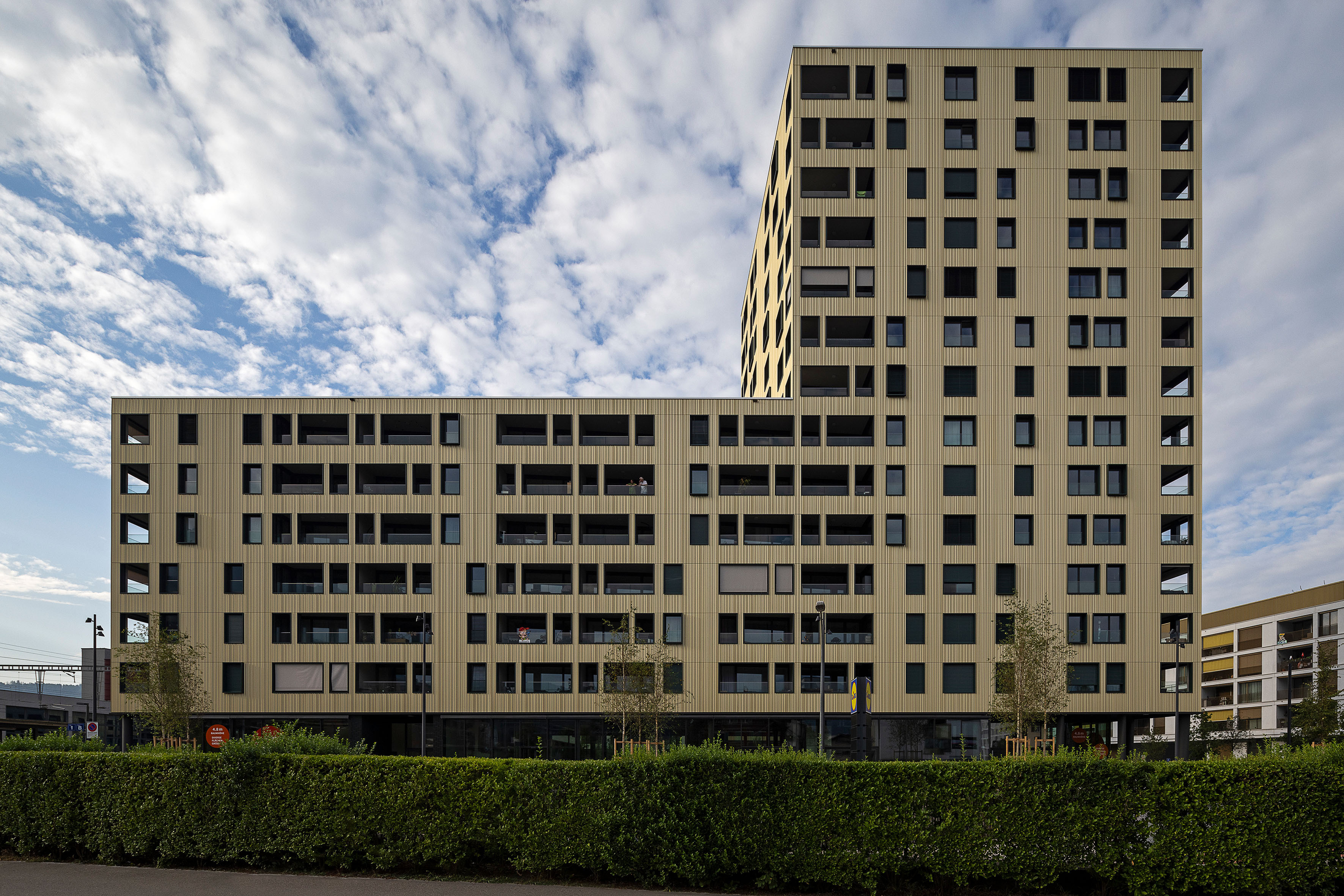 Beim Hochhaus entsteht westlich vorgelagert im 7. OG ein gestalteter Aussenbereich, welcher eine attraktive Aufsicht für die Bewohner des Hochhauses gewährleisten soll. Auf allen übrigen Dachflächen werden die West-Ost ausgerichteten Photovoltaikelemente geometrisch optimiert. Der fünften Fassade (Dachflächen) ist durch diese Anordnung viel Aufmerksamkeit zu schenken.