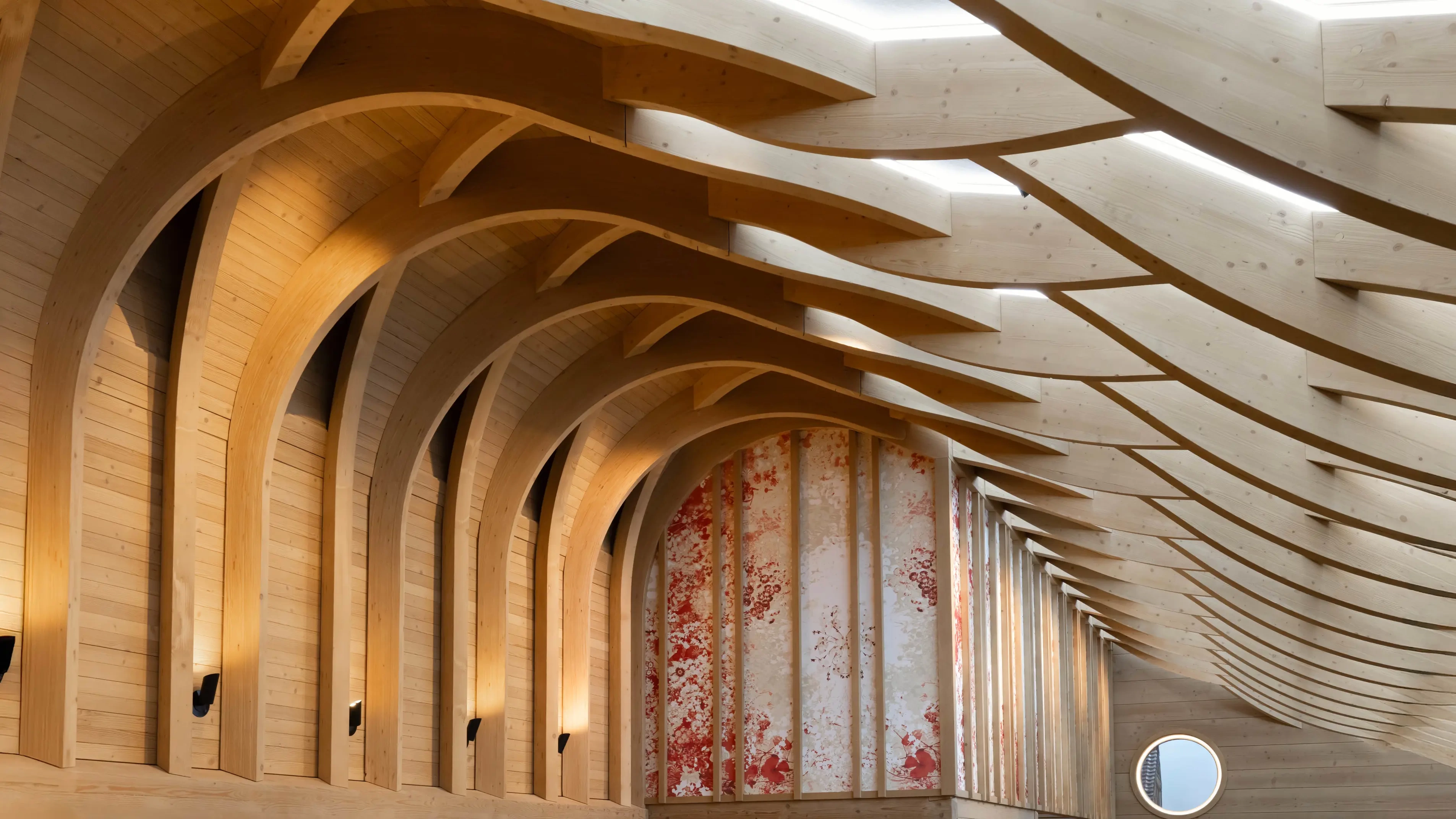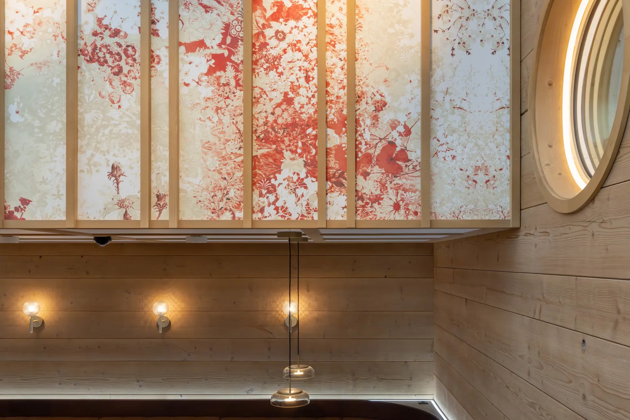 Die Innenatmosphäre wird durch die imposante sichtbare Holzkonstruktion des Dachs geprägt. Die Wandelemente, welche mit Jakob Schläpfer Stoffen bezogen sind, zeigen sich als Hingucker und nehmen so die Tradition der Ostschweizer Webereikunst auf. Die Fassade aus Holzschindeln im erdigen Braunton mit den Fensterrahmen in Ocker ergeben einen ansprechenden Kontrast. Die Erweiterung liest sich deutlich als Neubau, konkurrenziert jedoch nicht mit dem Bestandsbau.