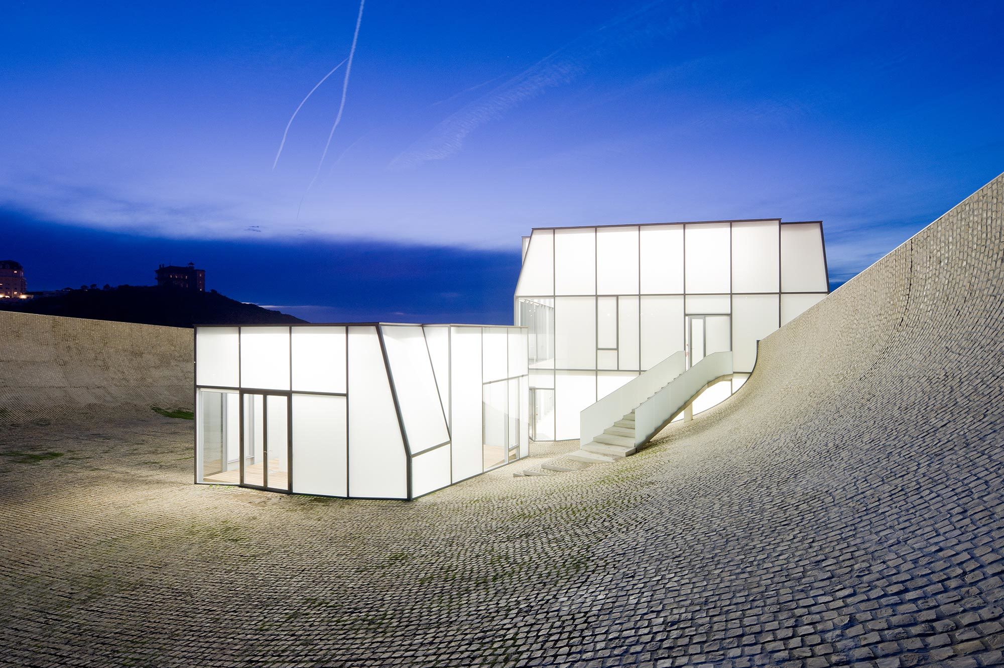 Die Gärten der Cité de l'Océan et du Surf zielen auf die Verschmelzung von Architektur und Landschaft und verbinden das Projekt mit dem Meereshorizont. Die präzise Integration von Konzept und Topographie gibt dem Gebäude ein einzigartiges Profil. Die Materialien des öffentlichen Platzes sind eine progressive Variante des portugiesischen Pflastersteinpflasters mit Gras und natürliche Vegetation. Zum Meer hin erstreckt sich die konkave Form des Bauplatzes durch die Landschaft.