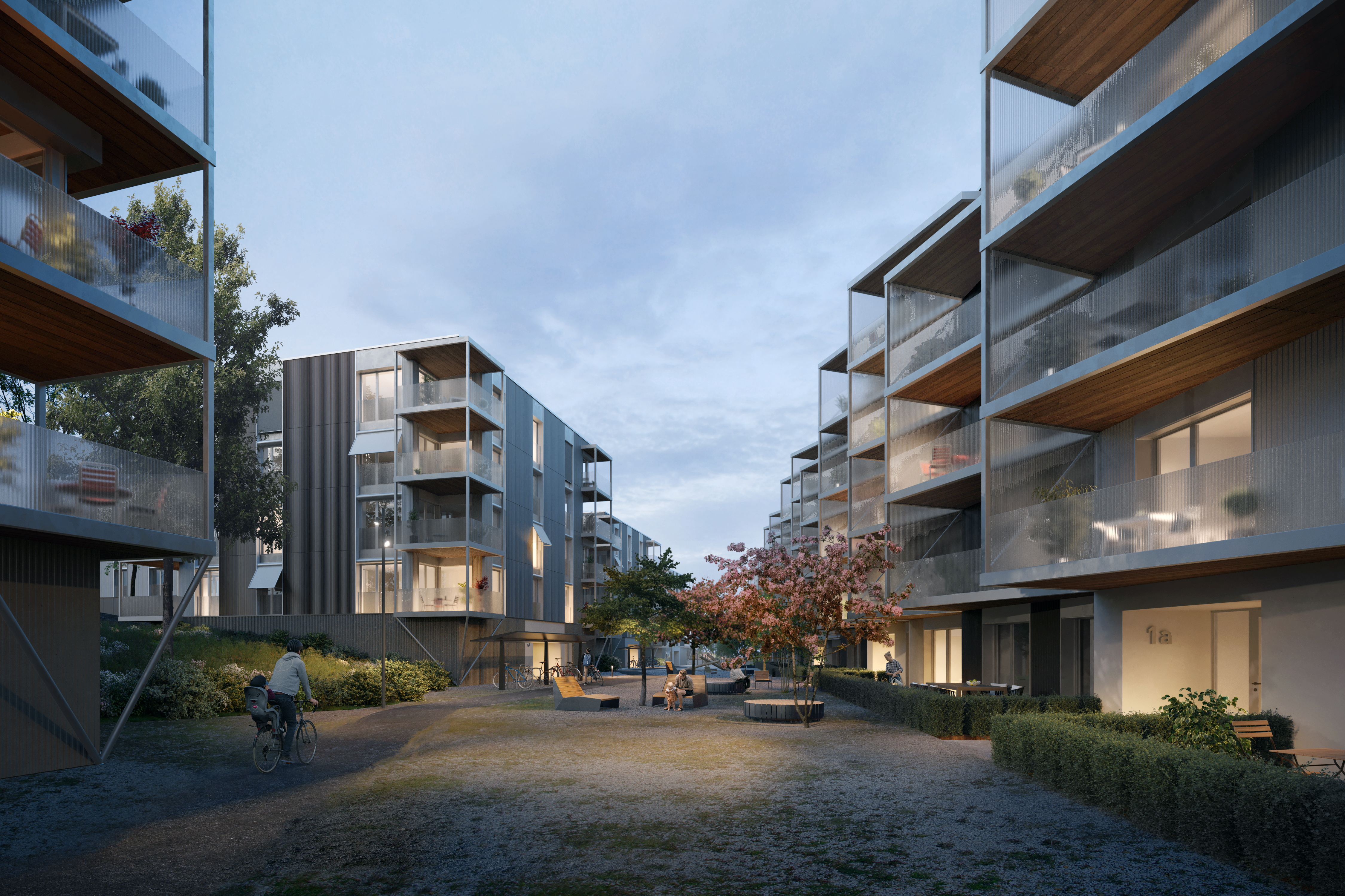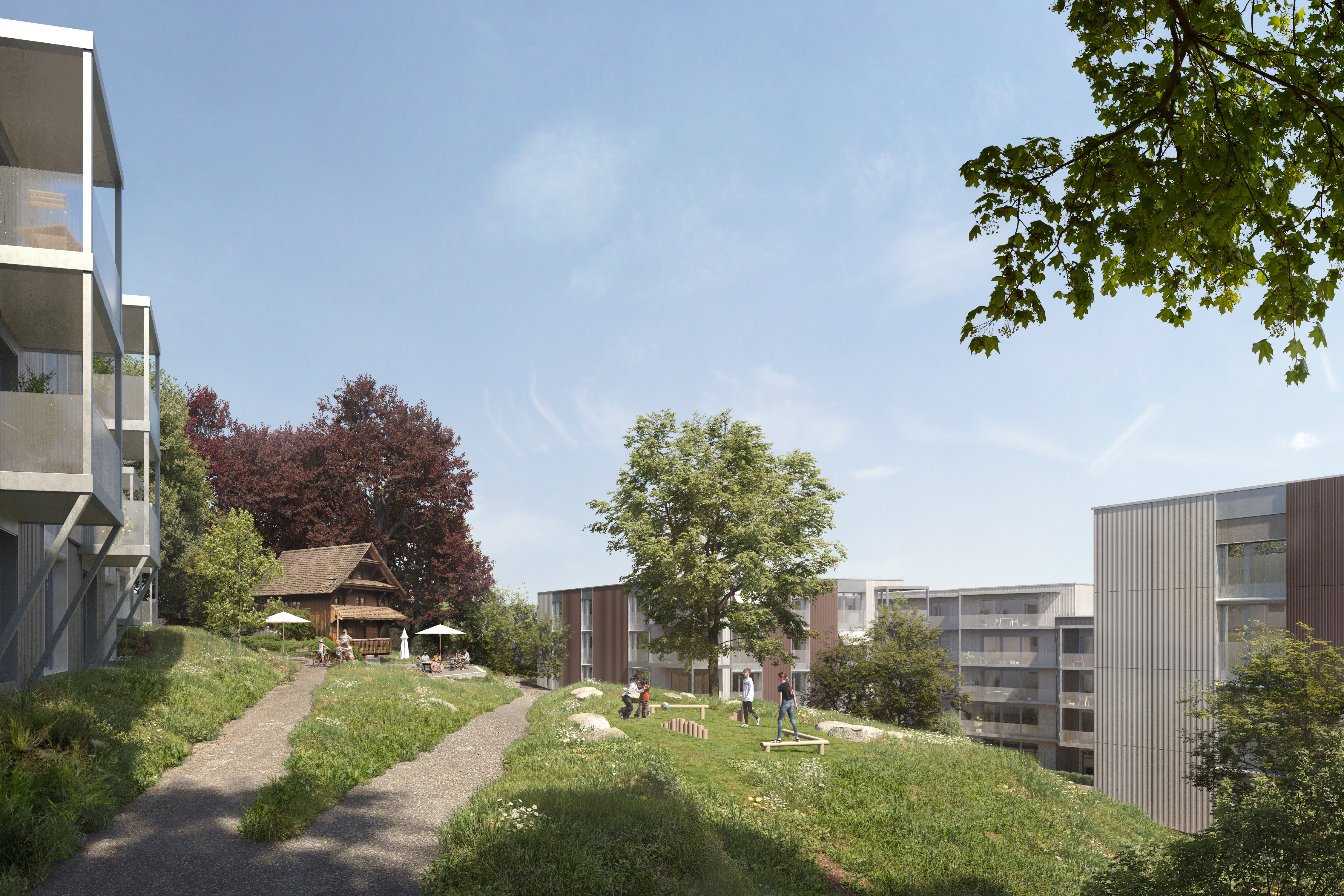 Grosszügige Aussenräume mit einem beeindruckenden Baumbestand bestimmen das Quartier. Die öffentlichen Durchgänge werden optimiert und mit einheimischen Bepflanzungen aufgewertet. Die entstehenden Aufenthaltsbereiche können gemeinschaftlich und vielfältig genutzt werden. Der Platz beim alten Spycher ergänzt die Aufenthaltsbereiche zwischen den Neubauten. Eingerahmt von grossen, alten Bäumen wird hier der heutige Charakter des Quartiers beibehalten.