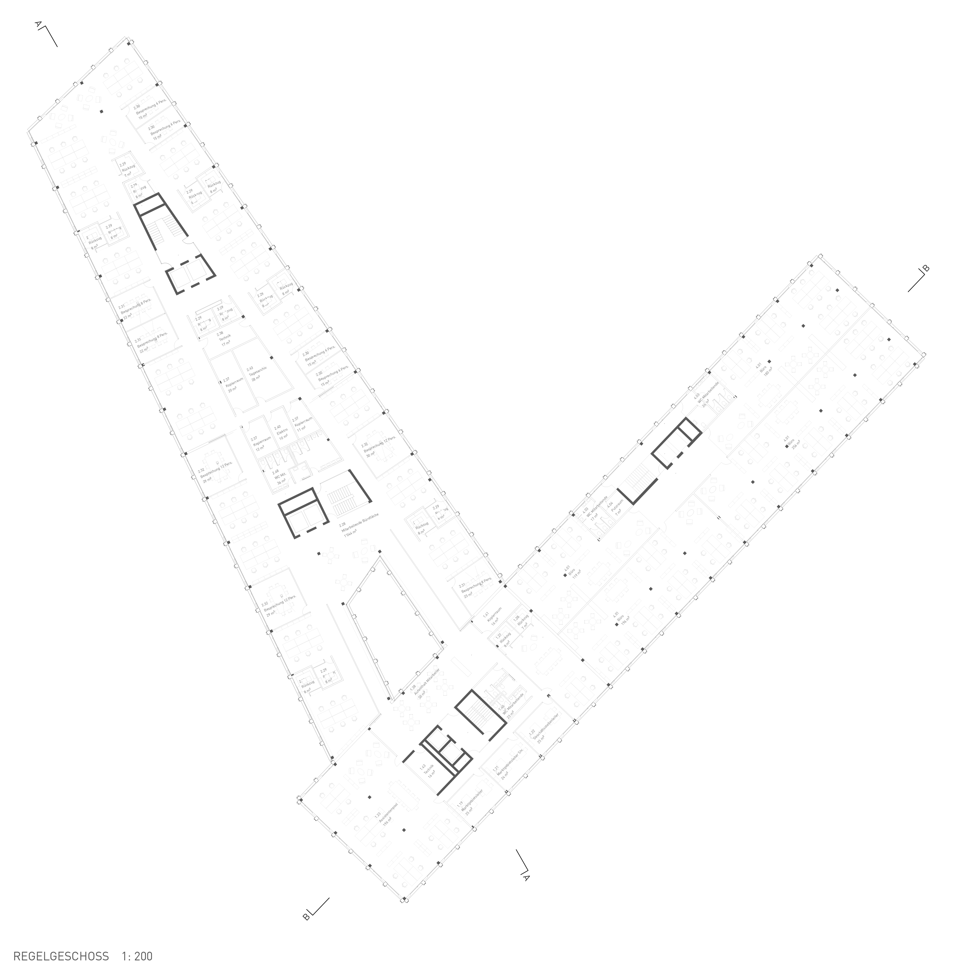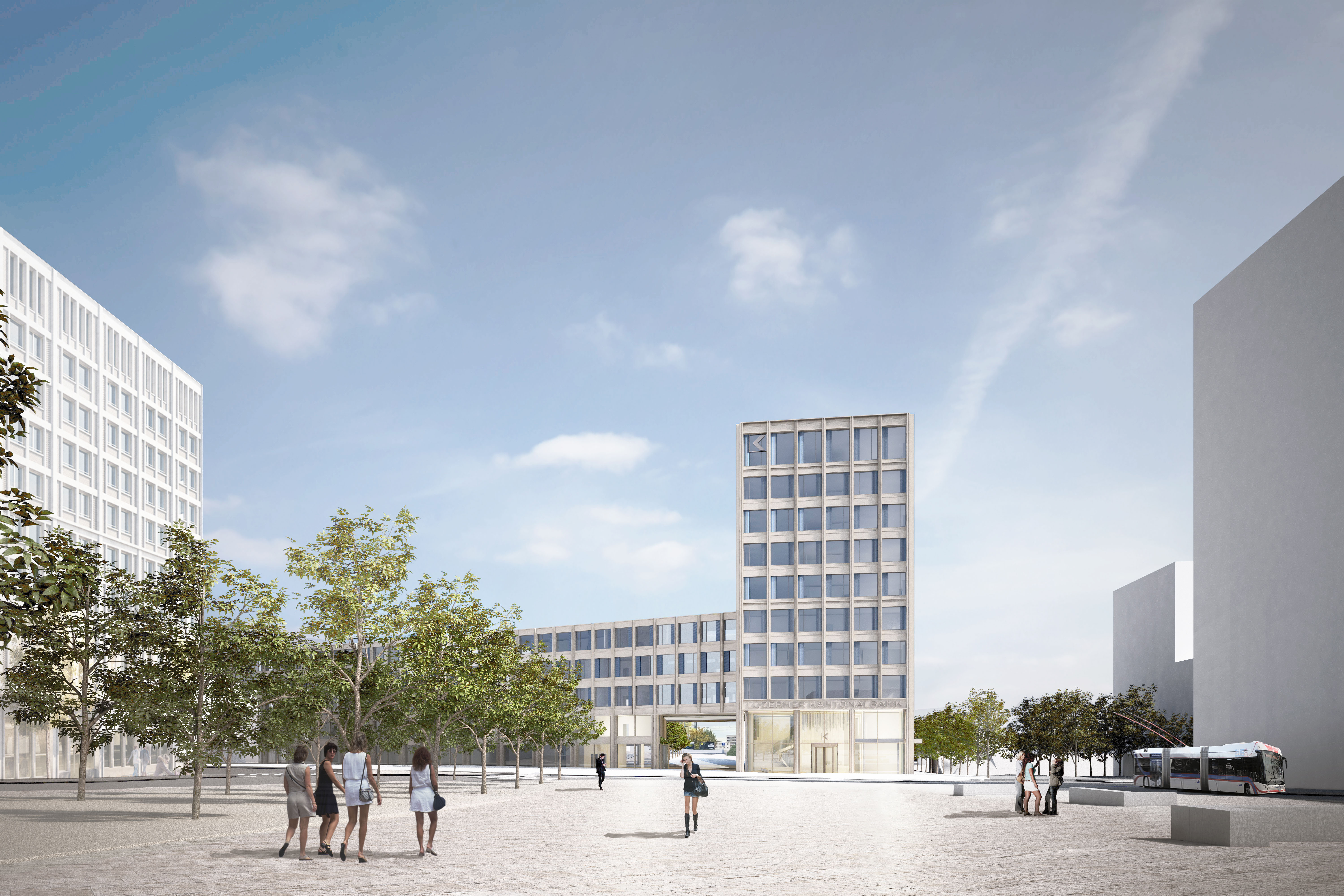 Dichte, Transparenz und Dialog zeichnen die Bebauung aus. Insgesamt entstand eine in drei Baukörper gegliederte, urbane Skulptur für Büro- und Gewerbenutzung. Der südlichste Teil des Komplexes manifestiert sich dank seiner schlankeren Proportionen als Turm, während die übrigen Gebäude durch ihre abgestuften Oberkanten auf die Tiefe des Busbahnhofs verweisen.