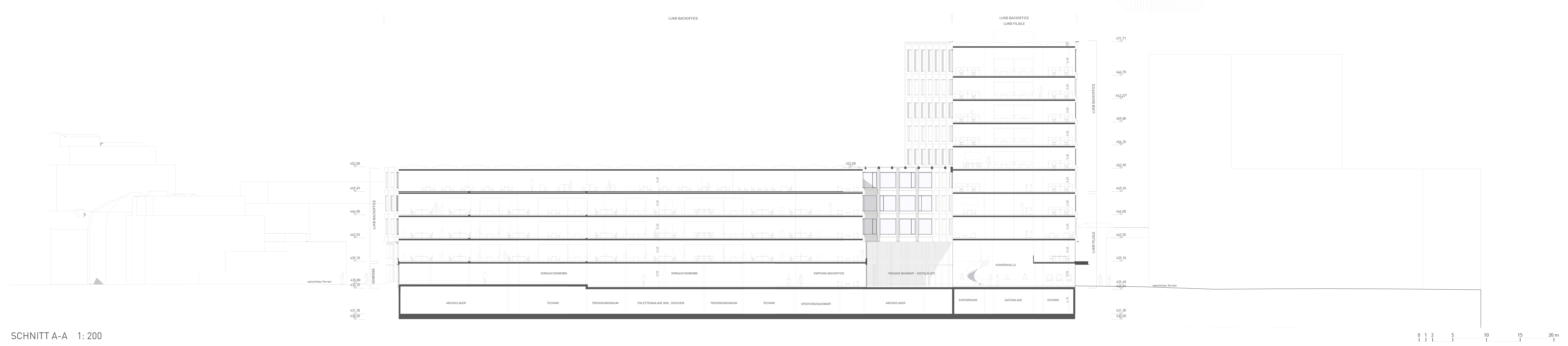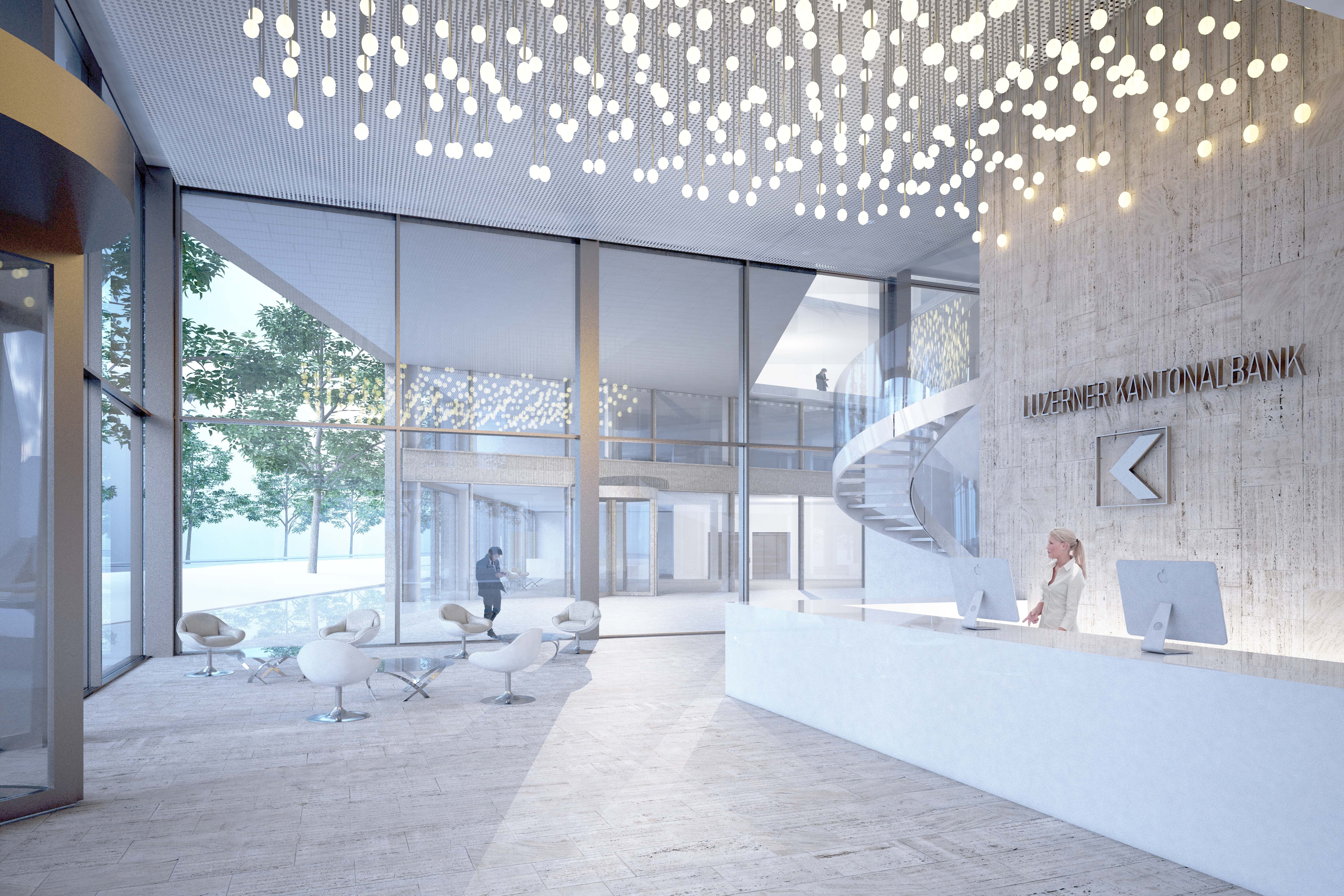 Eingänge und Passagen gliedern das Gebäude. Zwei « Brücken » verbinden die erste und zweite Etappe. Zwischen den «Brücken» entsteht ein grosszügiger Innenhof. Dieser fungiert als vertikale räumliche Verbindung, die dem Haupteingang des Gebäudes eine Hierarchie verleiht und die Möglichkeit bietet, die gemeinsamen Innenräume zu beleuchten, so dass eine Ansicht des gesamten Ensembles entsteht, die den skulpturalen Impetus der Architektur akzentuiert. Gerade dieses Anknüpfen und Offenlassen manifestiert sich auf Erdgeschossebene in eine Torsituation, die den Seetalplatz fliessend mit dem Bahnhof verbindet. Über dem repräsentativen Entrée entwickeln sich in den Obergeschossen der LUKB Filiale und Büroflächen, aufgespannt zwischen Fassaden und Erschliessungskernen. Hier können Arbeitswelten entwickelt und verändert werden, um den wechselnden Anforderungen der Dienstleistungsgesellschaft zu genügen. Identitätsstiftende Orte – hier in Form von mehrgeschossigen Räumen – fungieren als Kommunikationsbereiche.