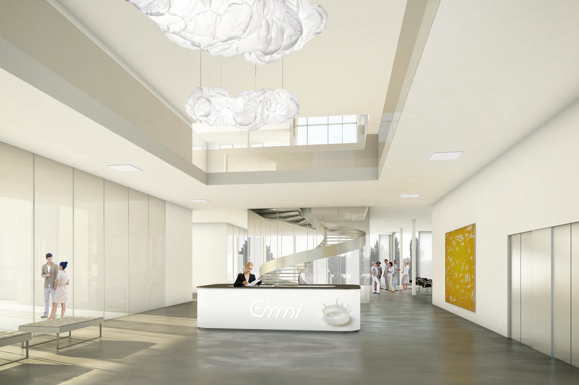 Aus dem Jurybericht heisst es weiter: «Der Emmi-Hauptsitz ist als klarer Kopfbau des Areals repräsentativ situiert. Der in der Grundfläche quadratische Baukörper mit seinen vier Geschossen (im Licht 3,5 m gemessen), wirkt zusammen mit den spiralförmig angelegten zweigeschossigen Kommunikationsräumen sehr offen und lichtdurchflutet. Der gewählte Stützenraster und die Anordnung der Vertikalerschliessungen ermöglichen eine ausserordentlich flexible Nutzungseinteilung. Das äussere Erscheinungsbild des Hauptsitzes ist neben seiner klaren quadratischen Grundform geprägt von einer, der Vollglasfassade vorgestellten, gut proportionierten Rasterfassade.»