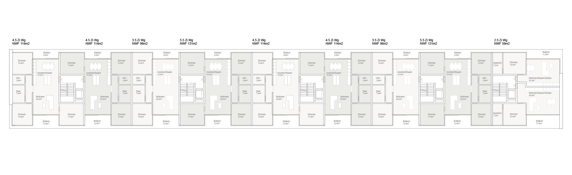 Die beiden Wohnbauzeilen sind entsprechend ihrer Lage und Situation von sehr unterschiedlicher Qualität. Es gibt die eher erdbezogenen Wohnungen in der westlichen Zeile und die eher himmelbezogenen Wohnungen in der östlichen Zeile.