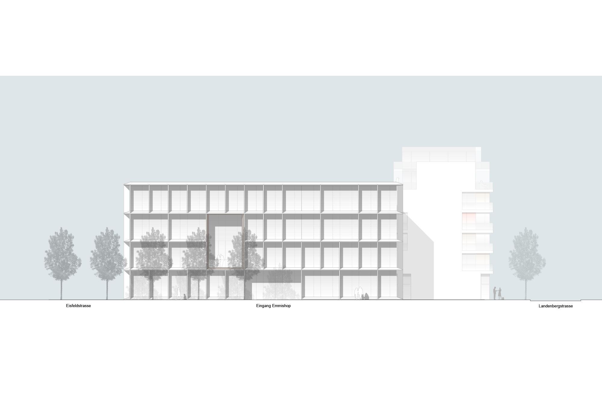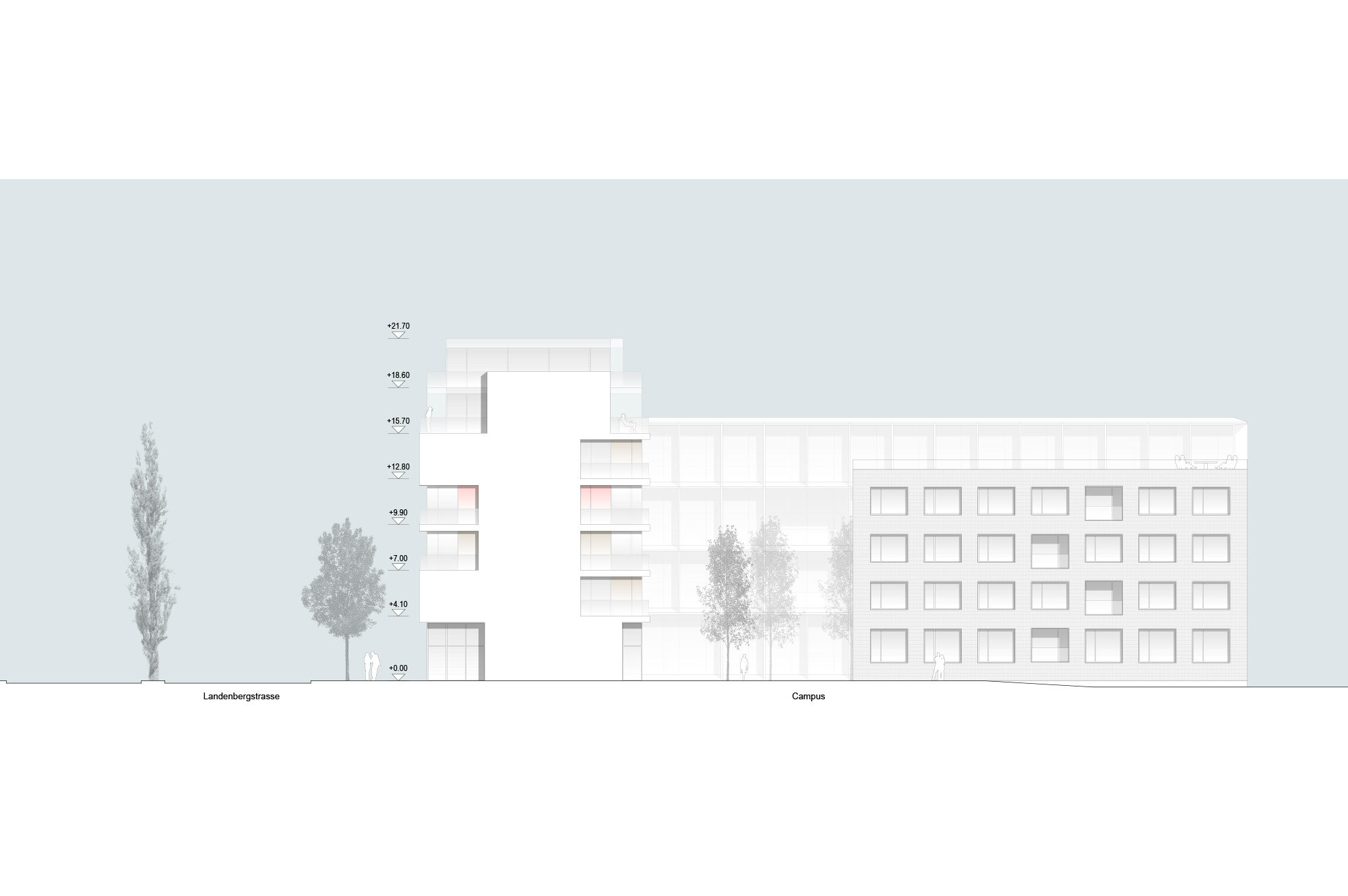 Die Erschliessung für den Fussgänger und die Anlieferung der drei Gebäude ist jeweils von Osten her ab der Landenbergstrasse vorgesehen. Die westliche Wohnzeile wird über den zentralen Aussenraum erschlossen.